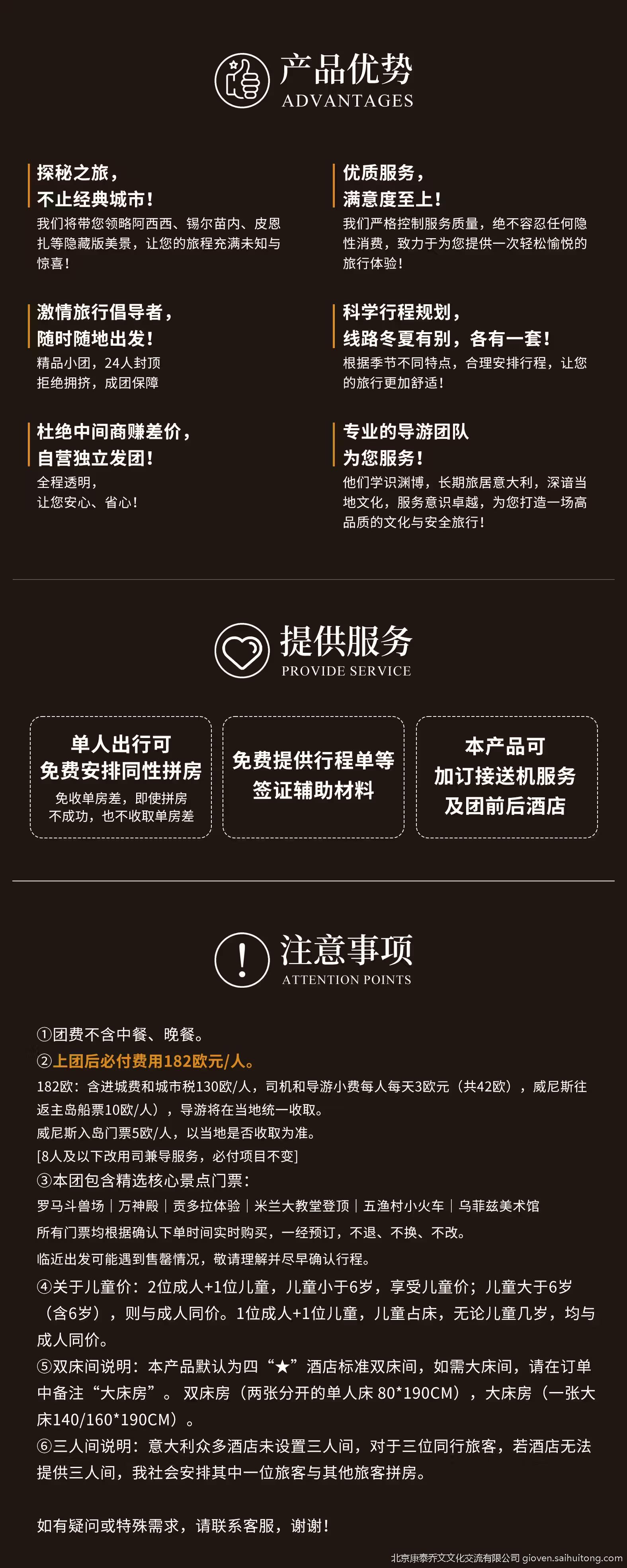 2026年2月12日、2026年2月19日、2026年4月23日这三个团期,分别受特殊节日活动(冬A0会)、米兰家具展的影响,米兰市区不设置上团点(没办法上团),如预定这个团期的,必须要加订一晚团前酒店,并于下午17:30分点在米兰斯福尔扎城堡跟团组大巴车一起前往团前酒店,第二天直接酒店上团。(团前酒店距离米兰市中心比较远,介意的慎拍)