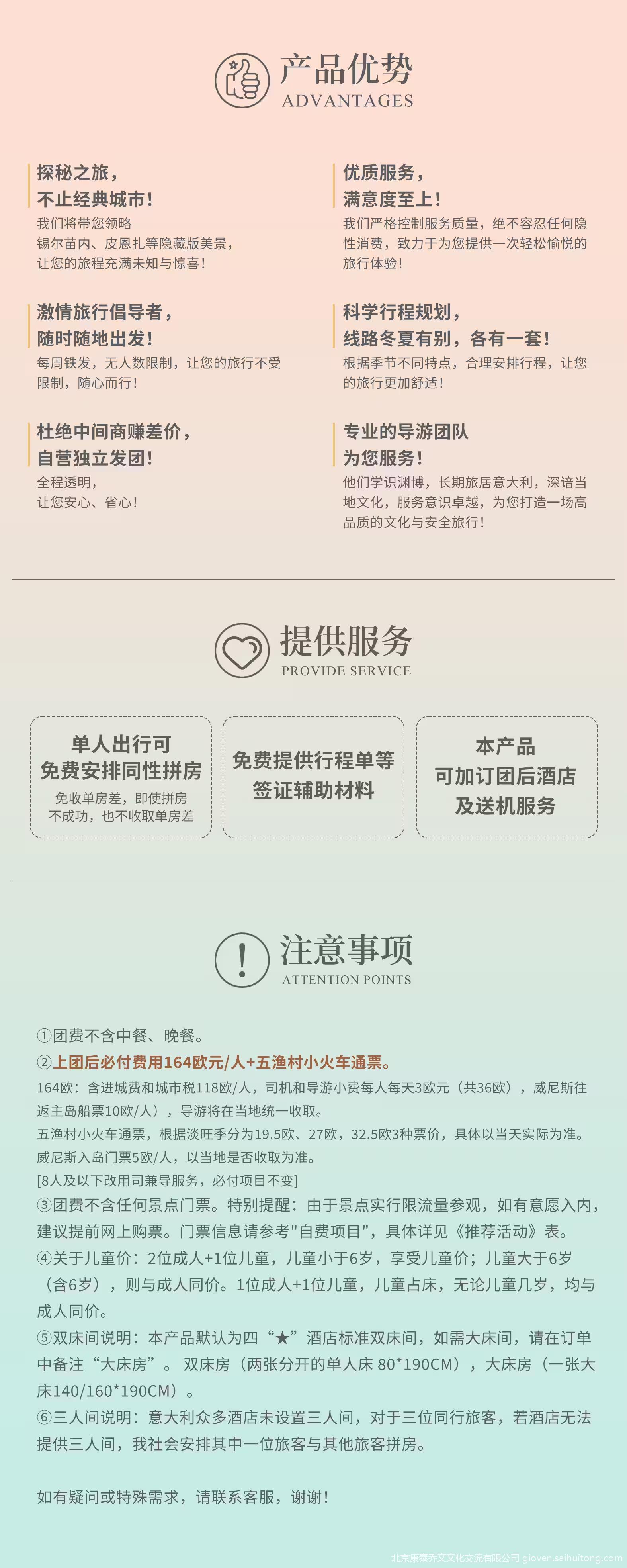 本产品由意大利旅游公司 Gioven Travel S.R.L. 提供目的地参团服务,具体的旅游服务和操作由委托社提供。协议双方知晓并同意本协议约定的地接社信息可能发生变更,委托社将在信息发生变更后及时通知旅游者,旅游者同意接受该等变更。